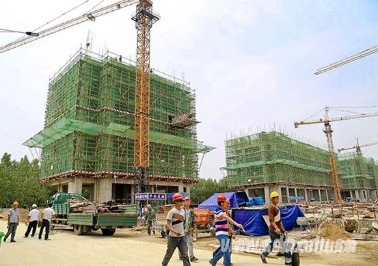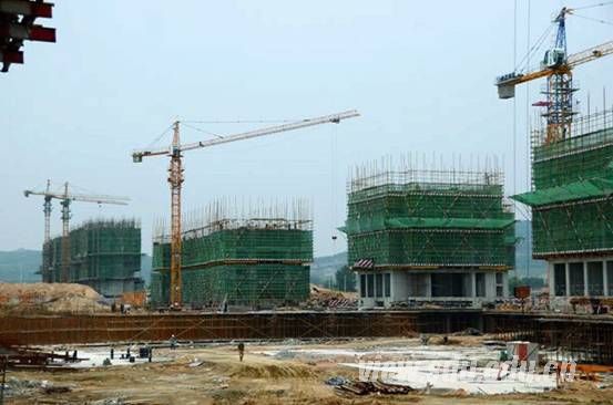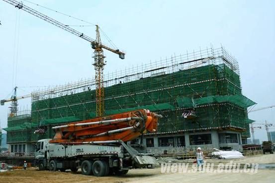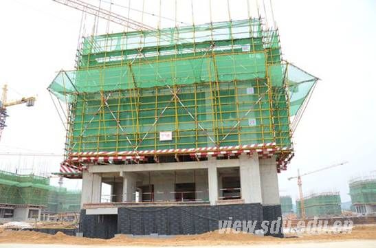 同时,学校明确了青岛校区教职工住宅区建设规划方案,规划方案以打造蓝色硅谷核心区中高档、示范型花园式社区为目标,强调一种城市性和自然休闲氛围的结合,为教职工提供优雅宁静舒适宜人的现代化城市社区。首批住宅计2612套,占地约320亩,户型面积分别为200㎡,180㎡,150㎡,130㎡,110㎡,共计五种,容积率约2.03,是蓝色硅谷核心内较低的建筑密度。目前,首批住宅工程施工已经全面展开,35栋楼已经同时开工,截止到发稿日,最快的主体已经建设到了7层(如图施工现场一),预计2014年8月底,能够完成主体施工,计划2015年年底完成住宅及小区室外道路、绿化、水、电、暖等配套设施施工,满足交付条件。