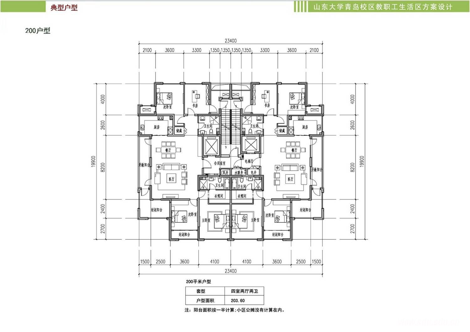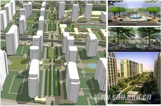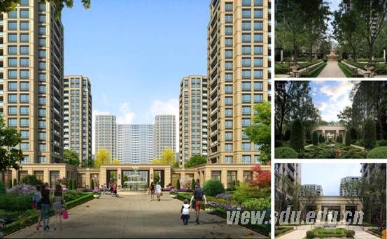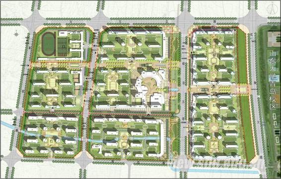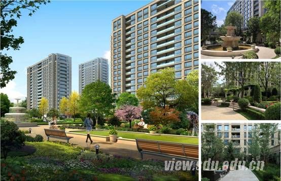 据青岛校区建设指挥部住宅建设负责人介绍,首批住宅全部为15-24层的新古典主义风格高层住宅,每层层高3.05米;每单元两户,严格按照国家有关建设规范的要求每单元配置两部电梯,其中一部为专用的医疗电梯,均按照高标准建造(而据实地调研,核心经济区其他开发住宅小区大都为一部电梯,层高约为2.8米)。同时学校住宅区设计人车分流,地面上只走行人和消防车辆,其他自用车辆均在整体开挖的地下车库通行;为确保建筑质量和住宅品质,生活区建设所用土、砂、钢以及管材器件,均采用质量最有保证的知名品牌,铝合金型材、配件采用国内知名品牌;生活区住宅采暖全部采用地暖形式,由于蓝色硅谷核心区内尚不具备城市集中供暖条件,需要各单位自行采取措施解决采暖问题,经学校与当地政府沟通,确定在青岛校区校园西北角专门建立一个供暖中心,辐射整个校园及生活区。此外,生活区还具备地理位置好、景观设计独特、设计标准高以及周边配套设施好等特点。以景观设计为例,生活区绿化标准比邻近的大部分商业开发楼盘高(别墅、联排等设计标准除外),绿化按 450元/㎡的标准设计,绿化率达30%,公共绿化空间依托社区中心步行空间展开,营造社区中心花园、中心广场、休闲走廊等一系列绿化景观,自然化与人工化相结合,强调园景与建筑间的相互呼应,形成网络化、多层次的绿化体系,以打造一流、舒适、优雅的居住社区(如图)。