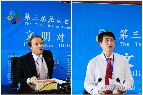 联合国文明联盟高级顾问克里斯托弗·贝斯(Jean-Christophe Bas)(左)在论坛开幕式发表主题演讲,尼山论坛常务理事、山东大学副校长陈炎(右)致辞并主持论坛