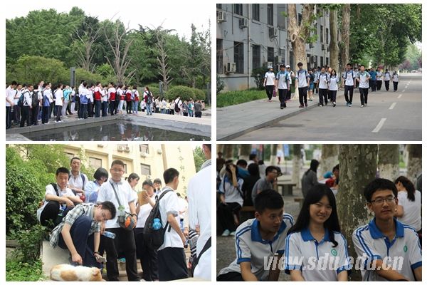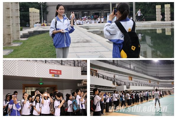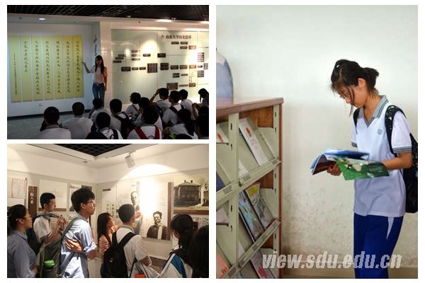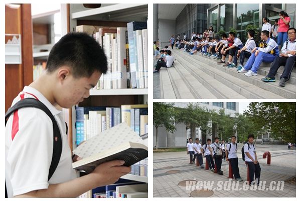 在蒋震图书馆,同学们在琳琅满目的图书中找寻自己感兴趣的书籍;在博物馆,同学们跟随讲解员领略了考古系师生的研究成果;在校史馆,讲解员结合图片向同学们生动展示了山大百余年辉煌的历史和众多名人名家;看到正在体育馆内打球的学长们,同学们都期待着自己将来也能在这里挥洒汗水;在游泳馆,同学们对泳道的设计赞叹不已;参观重点实验室的过程中,同学们近距离接触了先进的仪器设备,了解到许多前沿科研成果,并积极向讲解老师提问。看到在小树林学习的山大学子,一名来自菏泽一中的学生表示:“山大的环境很好,学习气氛也很浓郁,到处都有在学习的人,希望以后能考到山大来。”泰安一中的高一学生闫馨说:“感觉山大的学风非常好,学习气氛很浓,很符合我心目中对理想大学的定位。”