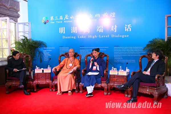 [本站讯]5月21日下午,第三届尼山世界文明论坛之明湖高端对话(第二场)在山东省图书馆大明湖国学分馆举行。尼山世界文明论坛副主席、全国政协常委、中国佛教协会副会长学诚,尼山世界文明论坛副主席、全国人大常委会委员、中国道教协会副会长张继禹与全国政协委员、中国基督教协会副会长代总干事阚保平就“多元信仰与共同伦理之中国经验”展开对话,基于各自信仰进行了独具特色的观点表述。尼山世界文明论坛常务理事、中华宗教文化交流协会副会长兼秘书长蒋坚永主持对话。