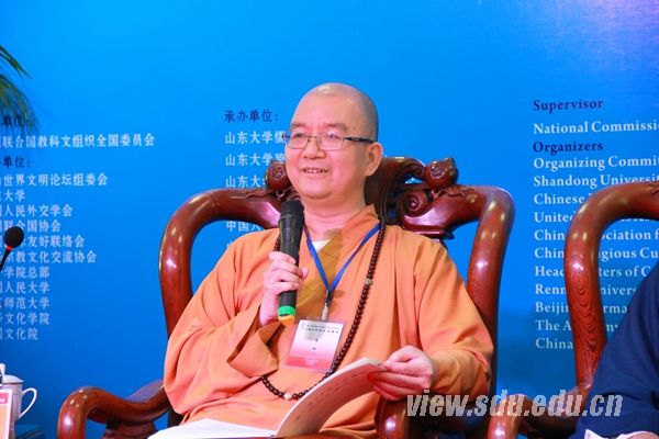 学诚说,中国儒释道三家几千年来一直和睦、和谐、和平共处,有很多硕果与成功经验,能够为当今世界信仰危机、各种思潮对立的情况提供借鉴。佛教在发展过程中吸收了儒家、道教的精神和文化,儒家、道教和佛教的交流也壮大了他们的学说。儒释道三家在中国历史上体现出了巨大的包容性,这也体现了中华文化对外来文化的巨大包容。他用“以儒治国,以道治身,以佛治心”的说法概括了儒释道的特点,表示三者在信仰的层面上有很多相通之处。他说,佛教尊重不同信仰、不同文明,这种圆融和包容使佛教在不同区域、不同时期有很好的传承。