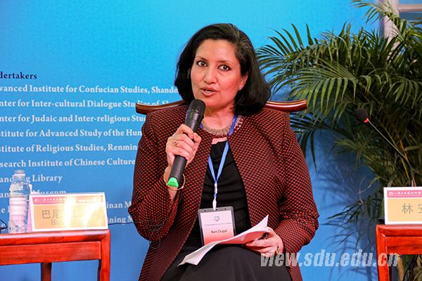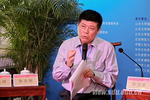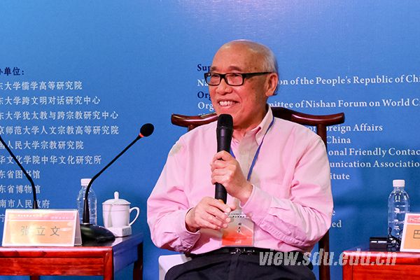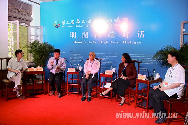 [本站讯]5月22日上午,第三届尼山世界文明论坛之明湖高端对话(第三场)在山东省图书馆大明湖国学分馆举行。北京大学哲学系、宗教文化研究院院长张志刚教授,中国人民大学、孔子研究院院长张立文教授,台湾慈济大学、宗教与文化研究所所长林安梧教授,巴哈伊国际社团驻联合国办公室首席代表巴尼•杜加尔(Bani Dugal)女士围绕议题展开对话。山东大学教授、儒学高等研究院副院长黄玉顺主持对话。