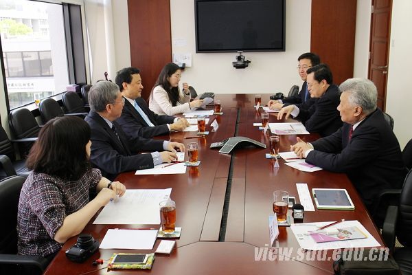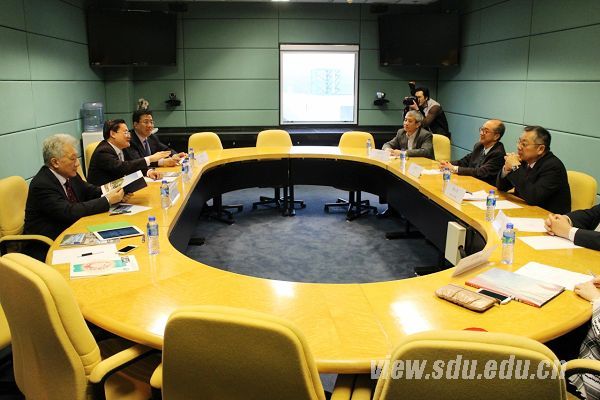 在香港科技大学,张荣同该校校长陈繁昌、副校长翁以登等进行了会谈。张荣回顾了两校间的科研合作和学生交流,并介绍了山东大学的学科布局。陈繁昌介绍了香港科技大学刚刚成立的能源研究所,以及在机器人、公共关系和创新创业等方面的重点发展计划。双方着重讨论了在共同感兴趣的重点领域开展更多科研合作、共同开设多种形式的联合课程以及举办联合学术研讨会等事宜。