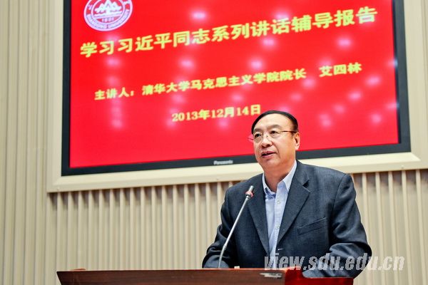 [本站讯]12月14日上午,山东大学党委中心组理论学习(扩大)会议暨领导干部专题报告会在中心校区举行,党的十八大精神中央宣讲团成员、中央马克思主义理论研究与建设工程首席专家、清华大学马克思主义学院院长艾四林教授受邀作学习贯彻习近平总书记系列讲话精神辅导报告。校党委书记李守信主持会议。