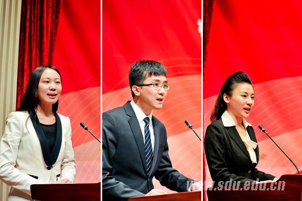 获奖本科生代表、尼山学堂2011级本科生胡静(左),获奖研究生代表、机械工程学院2011级博士研究生盖超(中)分别发言,哲学与社会发展学院2010级本科生、2012年度校长奖学金获得者孙凌云(右)主持典礼