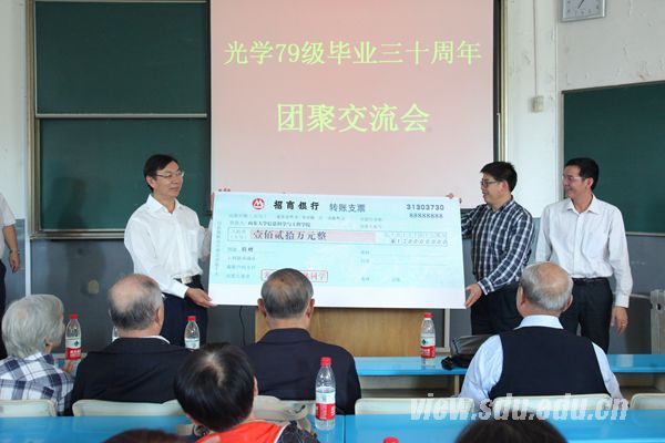 [本站讯]10月13日,山东大学光学79级校友在中心校区举行毕业三十周年团聚交流会。会上,光学79级全体同学发起设立“大爱光学”奖助基金,并首笔捐资120万元,积极支持母校建设。山东大学总会计师曹升元出席活动并讲话。