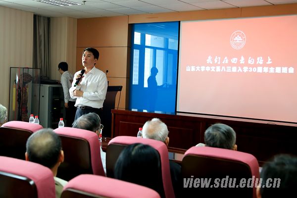 曾经执教83级的教师于维璋、滕咸惠、马瑞芳、牛运清、张可礼、解洪祥、吴开晋、王延晞、王培元、孔智光、张华、郑凤兰、谭好哲、马龙潜、耿建华、冯玮、王永革、贾殿贻、王晓等参加班会。与会老师们陆续发言,或回忆、或感慨、或嘱托、或祝福。时任83级级主任的孔智光教授声情并茂地朗诵了《沁园春•长沙》,带领大家一起回顾了那段“同学少年,风华正茂”的美好岁月。文学院院长郑春代表学院欢迎校友们回家,他说,校友返校活动最大的意义就是唤回青春,唤醒记忆,唤起一种温暖的情感,他介绍了学院近几年在教学科研、学科建设等方面的发展成就以及未来规划,期待校园内外的文院人建设好共同的精神家园。山大合作发展部部长王飞,文学院党委书记王德胜参加班会。