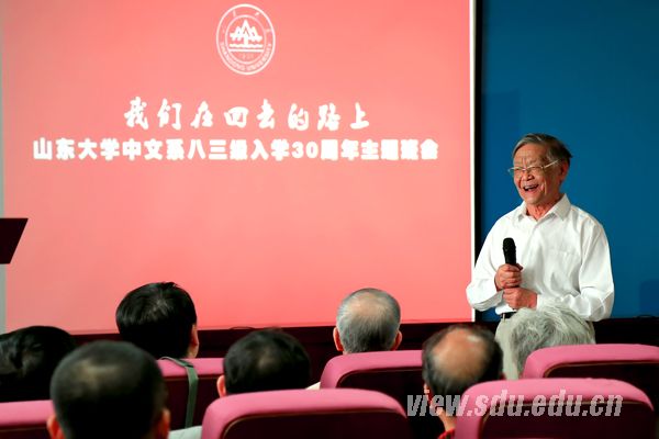 袁世硕先生感谢大家对母校和老师的惦念。他说,教师是最幸福的职业,每当听到学生捎带的问候,都会非常珍惜;每当知晓学生取得的成绩,都会倍感幸福;每次在报上看到学生的消息,都会无比高兴。陈炎回顾了自己和83级校友相处的岁月,并向校友们介绍了山东大学是一所“老大学”、“大大学”、“强大学”,指出校友们取得的成绩是对母校最大的支持,校友们对学校的真挚感情是对母校最好的礼物。