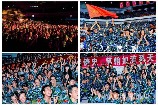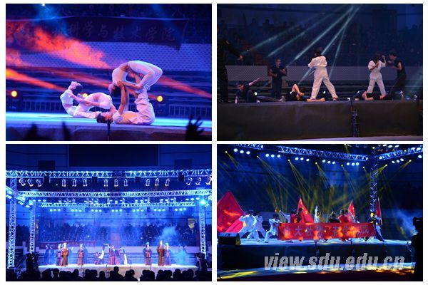 晚会伊始,新生辅导员用深情款款和英姿飒爽织就一方爱的锦帕,新生代表用青春活力和激情四射勾勒出美丽风景,点燃了全场晚会的气氛。“就在启程的时刻,让我为你唱首歌”,辅导员在新生大学启航之时,对他们表达美好的祝愿。看台上,新生们自发摇起手中的“荧光棒”大声跟唱,现场喝彩声、呐喊声、尖叫声混成一片,好不热闹。来自国际教育学院的学生们演绎着老舍先生的代表作《骆驼祥子》,生动饱满的形象塑造、栩栩如生的人物刻画,嬉笑怒骂间博得师生阵阵欢笑。山大各社团亮相迎新舞台,多风格、多主题的表演形成一道靓丽的社团风景线。轮滑协会、“云水禅心”瑜伽协会、街舞协会、书画协会、国学社、综合技击协会、梅花桩武术协会的同学纷纷表演了各自的拿手技艺,表达对新生的欢迎。