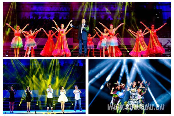 校园十佳歌手五强携带他们或清新隽永、或意蕴悠远、或昂扬向上的歌曲,为新生勾勒了象牙塔里的多彩生活,“山大校园歌手大赛”冠军李政军以一首活力四射的《I Can Only Imagine》点燃了全场激情。一曲《谁不说俺家乡好》,舜歌合唱团诉说着流年的缤纷;一支《最炫民族风》,大学生艺术团诠释着生命的怒放;啦啦操队如水一般灵动,激腾出希望的节拍;艺术学院舞蹈队如火一般热烈,照亮了光明的未来。方宏建与能动学院本科生牛嘉年、哲社学院研究生方垒倾情演唱了歌曲《青春山大》,并独唱一曲《朋友干杯》,代表山东大学全体师生对2013级新生的到来表示了热烈的欢迎和衷心的祝愿。