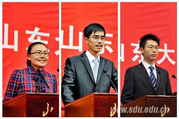 新生代表、经济学院2013级本科生张妮(左),研究生新生代表、山东大学2013年“研究生优秀生源奖励基金”获得者、电气工程学院2013级直博生宾子君(中)分别致辞,山东大学学生会执行主席、哲社学院2011级本科生侯培宇(右)主持典礼