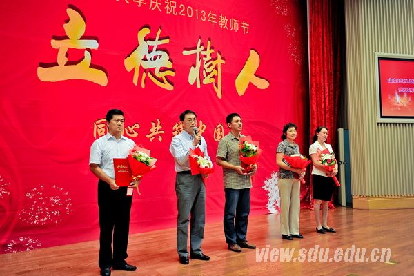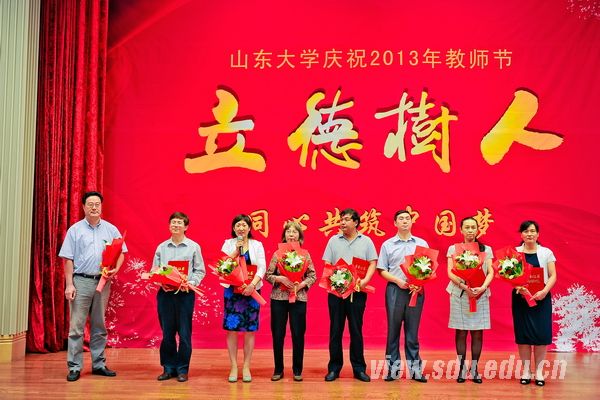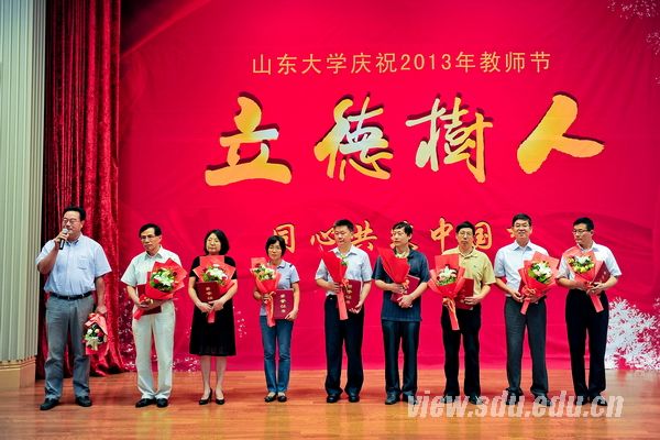 [本站讯]黑发积霜织日月,粉笔无言写春秋。9月10日下午,山东大学在中心校区知新楼A座三层报告厅隆重举行庆祝2013年教师节暨优秀教师表彰大会。本次表彰大会主题为“立德树人·同心共筑中国梦”。2013年“山东大学优秀教师”、2012-2013学年度“我最喜爱的老师”、第五届“我心目中的好导师”、“山东大学重大学术贡献奖”获得者、“山东大学先进教育工作者”分别登台领奖,共同接受全校广大师生在教师节送上的诚挚敬意、热烈祝贺和温馨祝福。
