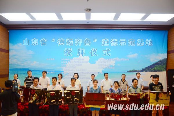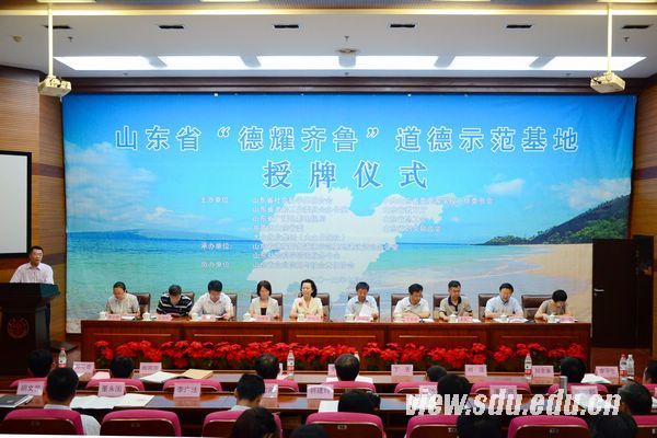 [本站讯]7月16至17日,山东省德耀齐鲁道德示范基地授牌仪式在山东大学中心校区知新楼思源报告厅举行。山东大学校领导方宏建出席会议并致辞。山东省社联党组成员、副主席李海萍,山东省老龄工作委员会办公室副主任于振业,山东省总工会副主席王星海,山东省妇联副主席范晓丽,山东省工商局原巡视员、山东省企业信用与社会责任协会会长王天仁出席会议。