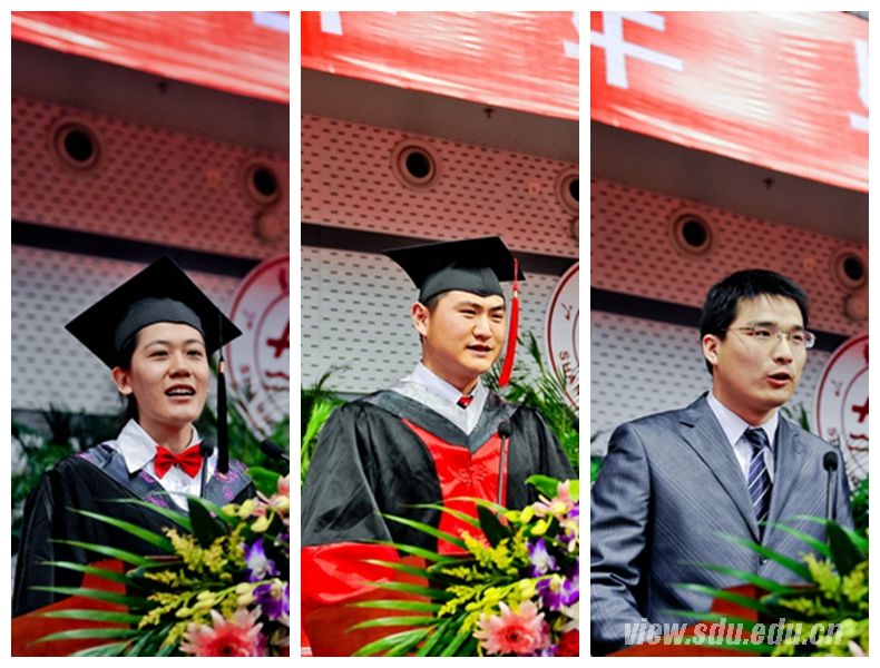 本科生代表、医学院2008级学生牛小溪代表全体本科毕业生向母校和老师们表示最衷心的感谢。她表示,母校使自己学会了为人处世、独立解决问题;学会了面对现实、面对逆境;学会了合作与竞争,分享与共赢,从昔日的青涩少年成长为合格的毕业生。她表示作为听着“山大故事”入校的一届本科生,将不忘师长的教诲,母校的嘱托,牢记“为天下储人才,为国家图富强”的宗旨,发扬母校的优良传统,早日成为“公民楷模、社会领袖、国家栋梁”。研究生代表、化学与化工学院2010级博士毕业生董人豪代表全体毕业研究生表达了对大学生活的无限眷恋以及对母校辛勤教育的衷心感谢。他说,在生命中能有这样一段珍贵的岁月与母校共成长,感到无比幸福;作为山大学子,我们共同见证了母校的跨越式发展,正在为创建世界一流大学的宏伟目标努力奋斗,我们深受鼓舞并为之自豪。他表示在未来的日子将牢记“学无止境、气有浩然”的校训,志向远大,踏实做人,阔步向前,让世界感受到山大人的精神。