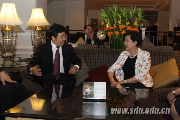山东大学校长徐显明(左)与中国国务院参事、国家汉办主任、孔子学院总部总干事许琳(右)交谈