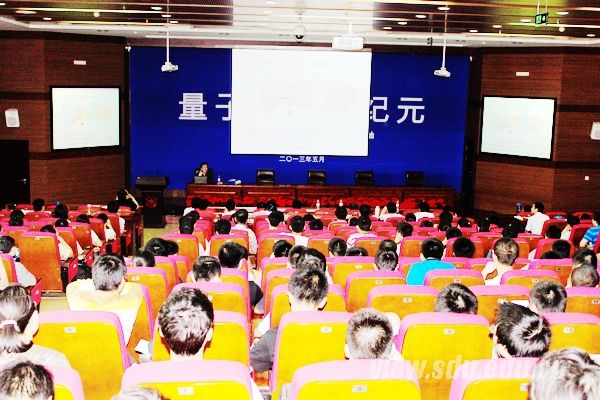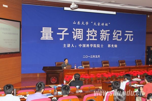 下午,郭光灿院士做客山东大学“大家讲坛”,作了题为“量子调控新纪元”的学术讲座。他从阿罗什和瓦恩兰两位诺贝尔物理奖得主的研究出发,引领同学们进入量子力学的微观世界,在将经典力学与量子力学对比的同时,通过薛定谔猫以及EPR悖论等诸多案例对问题进行了深入浅出的讲解,并由此引出了第二部分内容“量子纠缠的妙用”。郭光灿院士从与经典计算机相比的突出优势,未来发展所需的量子芯片、量子编码和量子算法和发展现状及困境三方面重点讲解了“量子计算机”,并在“光子究竟是什么”的部分中介绍了量子的惠勒延迟选择实验及其实现。郭光灿院士的讲解内容充实、条理清晰,深深地启迪了同学们对于学术问题的浓厚兴趣和对未知世界的无尽求索。梁作堂主持讲座。