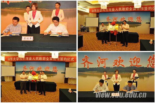 仪式上,曹升元与魏洪祥共同为“山东大学学生创业实践基地”揭牌。合作发展部部长王飞与孟令兴共同为“山东大学青年创业园(齐河园区)”揭牌。校团委书记马晓琳分别与齐河常务副县长王洪林、副县长赵传雷签订了《山东大学与齐河县人民政府共建“山东大学青年创业园(齐河园区)”协议》、《山东大学与齐河县人民政府共建学生创业实践基地协议书》。法学院院长齐延平分别与齐河县法院院长张军、齐河县检察院检察长范树林签订了《山东大学法学院与齐河县人民法院合作协议书》、《山东大学法学院与齐河县人民检察院合作协议书》。另有两个创业项目与齐河县科技局签订了入驻协议。齐河县委副书记董庆新主持仪式。
