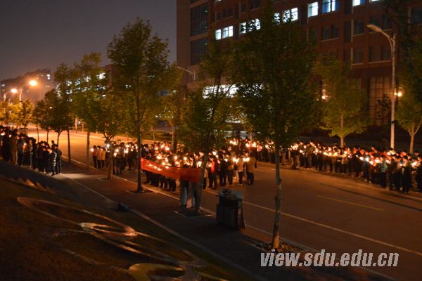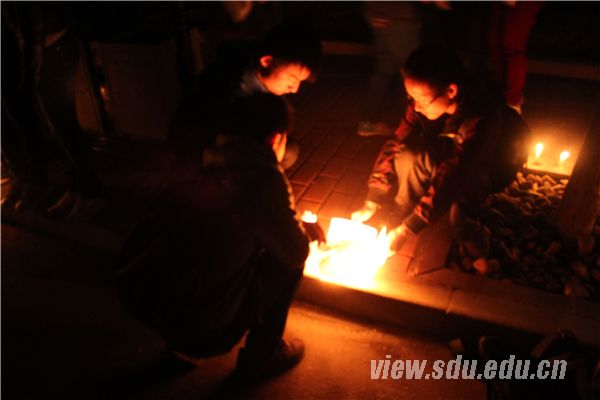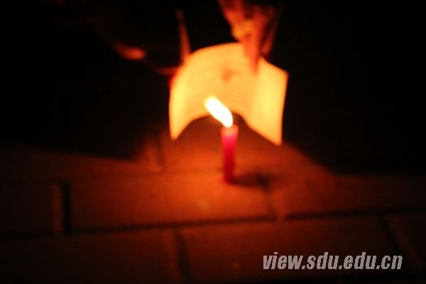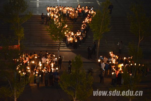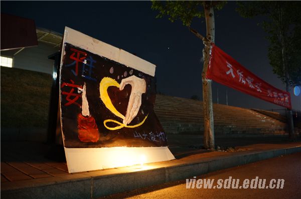 [本站讯]4月20日8时2分,四川省雅安市芦山县附近(北纬30.3度,东经103.0度)发生了7.0级地震。震区人民的安危时刻牵动着山大青年学子的心。为使逝者安息,令生者坚强,4月21日晚,山东大学爱心协会在兴隆山校区为雅安人民举行“天佑雅安”祈福活动。