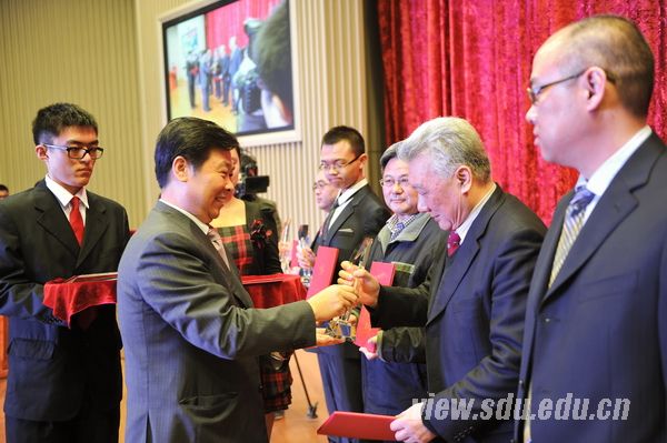 山东大学党委书记李守信(上图)、校长徐显明(下图)为获奖者颁奖