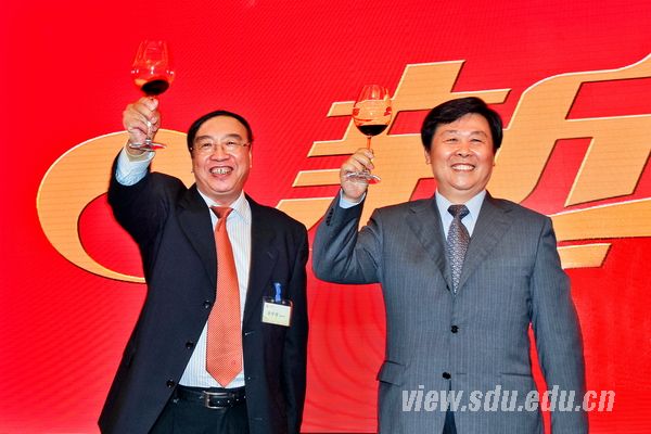 李守信、徐显明共同举杯,代表山东大学全体师生员工向在座嘉宾表示感谢并致以新春的祝福。现场气氛隆重热烈、喜庆祥和。山东大学校友、山东省委组织部副部长、人社厅厅长韩金峰,山东省省立医院院长秦成勇先后致辞,表示山东大学种种骄人成绩的取得让他们由衷高兴、倍感自豪。他们对山东大学的培养之情永远难忘,在为山东大学送上了自己的美好祝愿的同时,表示将全力关心、支持山东大学各项事业的发展。