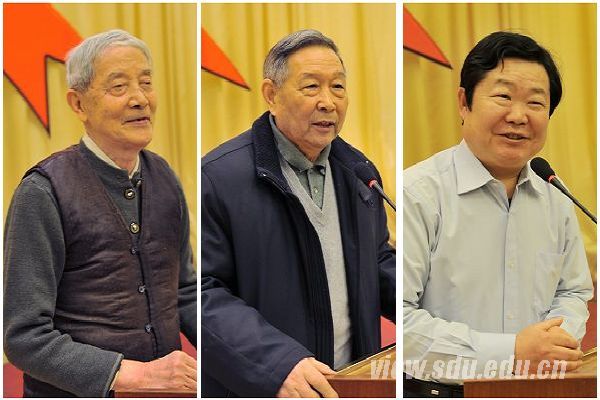 原山东大学党委书记陈之安(左)、原山东工业大学校长邹增大(中)、九三学社山大主委刘树伟(右)分别发言