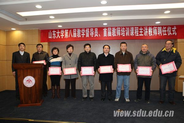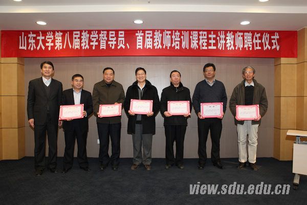 [本站讯]1月10日,山东大学第八届本科教学督导员、首届师资培训课程主讲教师聘任仪式在中心校区知新楼第四讲学厅举行,副校长陈炎出席聘任仪式并向受聘的本科教学督导员和师资培训课程主讲教师颁发了聘书。 陈炎在致辞中介绍了目前我国高等教育所面临的严峻形势,分析了中西方本科教学的差别,提出要依靠三方面的力量促进学校本科教学质量的全面提升:要充分依托教学促进与教师发展中心的专业人才队伍,明确职责和发展方向,发挥政策和技术优势,通过合理调配,实现教育资源和教师队伍的最佳配比,促进教学的开展;要充分调动学生作为教学主体的积极性,通过多种形式对教师教学进行有效的评价和监督,促进教师自发地改进教学方法,提高教学能力,提升整个教师队伍的教育教学水平;要充分依靠本科教学督导员在各教学环节中的督导作用,既能帮助优秀教师脱颖而出,又能帮助后进教师发现问题,同时充分依靠师资培训主讲教师帮助新入职教师迅速提高教学能力,并有针对性地帮助后进教师解决教学中所存在的问题。 本科生院常务副院长胡金焱主持仪式,并介绍了本科生院在提高本科教学质量方面所做的工作。本科生院副院长、教学促进与教师发展中心主任张树永宣布了山东大学第八届本科教学督导员、首届师资培训课程主讲教师名单。王丽娜作为督导员代表介绍了督导员在课堂听课、试卷检查、通识课及双语教学效果调查等方面的工作情况,对新一届督导员工作的开展提出了建议。学术研究部部长赵显作为师资培训课程主讲教师代表,着重就和学术道德氛围下的教师队伍师德师风建设进行了阐述,表示将努力帮助山大教师——尤其是青年教师,更好地处理好教学与科研的平衡。 为贯彻落实《山东大学进一步提高本科教学质量实施办法》,不断提高学校师资队伍质量和教育教学质量,努力打造一支育人理念先进、教学责任心强、教学能力精湛的高水平师资队伍,山东大学教学促进与教师发展中心在全校范围内首次聘请了27位师资培训课程主讲教师,其中有国家级和省级教学名师、多年从事教学研究的专家。为规范教学管理,推进教学改革,保障教学质量,中心聘请了27位本科教学督导员进行本科促进与督导工作。本次聘任的教学督导员和培训主讲教师聘期为2年。