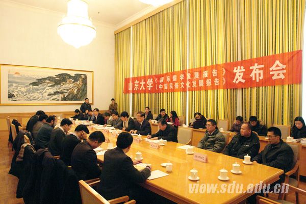 [本站讯]12月26日,由山东大学承担并完成的教育部项目《国际儒学发展报告》、《中国民俗文化发展报告》2012年度报告发布会在济南南郊宾馆举行。国务院国学研究中心副主任李文亮、文化部民族民间文艺发展中心主任李松、山东省政协副主席王志民、国际儒学联合会秘书长牛喜平、中国孔子基金会秘书长王大千出席发布会并致辞。发布会由山东大学副校长陈炎主持。