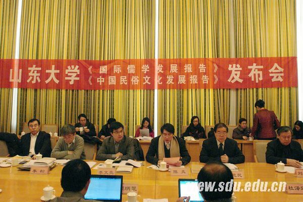 山东大学儒学高等研究院颜炳罡教授与民俗学研究所所长张士闪教授分别代表课题组就《2012:国际儒学发展报告》、《2012:中国民俗文化发展报告》作了汇报。儒学高等研究院杜泽逊教授和学术研究部有关负责人,两个课题负责人和课题组主要成员以及来自中新社、《人民日报》、《光明日报》、《中国教育报》、《中国文化报》、《中国社会科学报》等30多家媒体的记者参加了发布会。