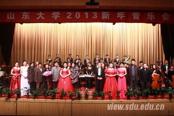 山东大学2013新年音乐会是山东大学交响乐团乐团面向全校师生举办的新年音乐会。音乐会内容丰富、风格多样,既有浓郁异国风情,又不乏民族特色。《节日序曲》以欢快、热烈的节奏开拉开序幕,动听的乐曲洋溢着节日的欢快,也充满异国情调;《茉莉花》等民族音乐和哈恰图良《莱次金舞曲》、格里格的《a小调钢琴协奏曲》、德沃夏克的《斯拉夫舞曲第八号》、约翰·施特劳斯的《铁匠波尔卡》等世界名曲相继呈现;艺术学院2009级声乐专业学生肖鹭丹演唱的《芦花》和《谁不说俺家乡好》,悠扬动听,令人沉醉;艺术学院2009级二胡专业学生邵雅楠带来的二胡协奏《雪山魂塑》气势磅礴、坚强有力,真实刻画了红军长征的艰苦历程,生动地捕捉到了栩栩如生的革命战士的形象;范雅婷演唱的歌剧《卡门》中的唱段《哈巴涅拉》,将主人公卡门的人物性格刻画得惟妙惟肖;艺术学院青年声乐教师刘书妤演唱的《我爱你中国》大气悠扬,饱蘸情感,熟悉的旋律再次打动观众的心,将音乐会推上了高潮。音乐会在伯恩斯坦的《坎地德序曲》中落下帷幕。校团委书记马晓琳,艺术学院院长李晓峰、党委书记史永志,校党委宣传部、艺术学院等相关负责人观看了音乐会。