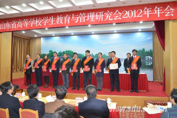 会上,山东师范大学党委书记商志晓作了“学习贯彻党的十八大精神”的专题报告。中国海洋大学等7所高校作大会交流发言。与会代表分别就“如何做好立德树人工作”、“如何深入开展大学生社会主义核心价值体系学习教育”、“辅导员职业能力建设”、“如何培养大学生社会责任感、创新精神和实践能力”、“如何提高大学生公民道德素质”和“如何加强校园网络文化建设和管理工作”进行了分组讨论。大会对2012年度全省高校学生教育管理工作优秀科研成果获得者和山东省第四届“十佳百优”辅导员进行了表彰,其中山东大学获优秀科研成果一等奖3项,二等奖4项,三等奖3项,经济学院齐山华获“十佳辅导员”称号。会议还完成了研究会高职分会换届工作,听取了研究会赴省外高校学习考察情况汇报和研究会人员调整情况汇报。山东省委高校工委宣教处处长刘欣堂作大会总结发言。来自全省110所高校分管学生工作的校领导以及学工部、研工部负责人参加了年会。