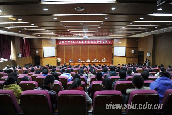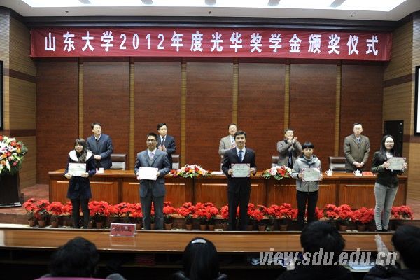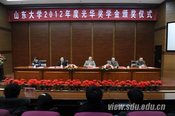 党委学生工作部部长曲明军主持仪式。仪式上,党委研究生工作部部长王君松宣读了《山东大学关于表彰2012年度光华奖学金获得者的决定》。信息科学与工程学院2010级硕士生兰伟霞代表获奖学生发言,表示会继续坚持刻苦勤奋的科研态度,同时感染身边的同学,不断争取更好的成绩,用实际行动回馈每一位给予他们帮助和感动的人。