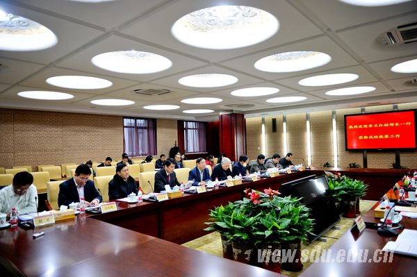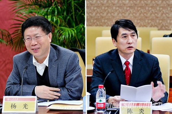 教育部社会科学司司长杨光(左)就儒学与中华文化复兴协同创新中心的建设谈了自己的意见,山东大学副校长陈炎(右)作了儒学与中华文化复兴协同创新中心建设进展情况汇报