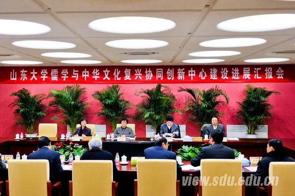 汇报会上,杨光就儒学与中华文化复兴协同创新中心的建设谈了两点意见,表示协同创新一方面必须是一流的,集全国高校之力,就某一个问题进行攻关,并带有相对的唯一性;另一方面必须要创新机制,最终要达到做人文社会科学领域“大科学”的目的。陈炎介绍了山东大学在推进儒学与中华文化复兴协同创新方面的独特优势,回顾了中心建设经历的几个阶段,介绍了积极探索机制体制改革新途径新模式取得的成绩以及在未来要努力实现的目标。山东大学儒学高等研究院执行副院长王学典重点就人文社会科学领域同样需要协同创新的观点进行了阐述。