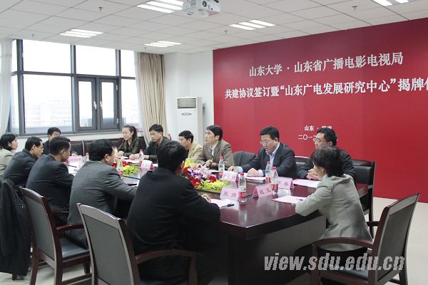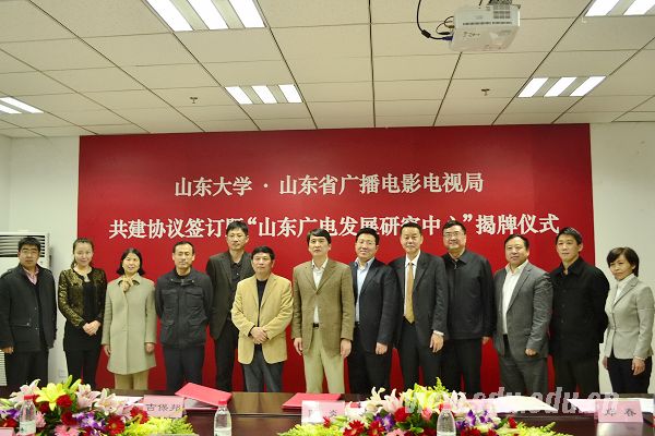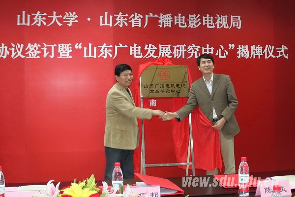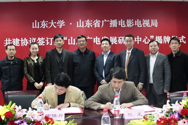 [本站讯]11月21日,山东大学与山东省广播电影电视局共建协议签订仪式暨“山东广电发展研究中心”揭牌仪式在山东大学中心校区举行。山东大学副校长陈炎与山东省广电局副局长吉保邦签署共建协议,并为中心揭牌。