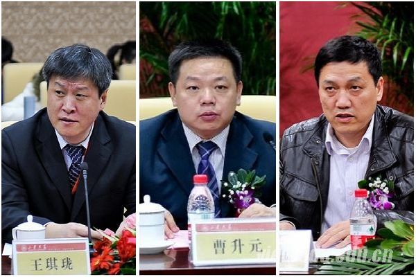 山东大学常务副校长王琪珑(左)、总会计师曹升元(中)分别主持理事会换届大会、第二届理事会第一次会议,山东省民间组织管理局副局长徐建国(右)在会上讲话