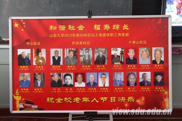 [本站讯]10月23日(农历九月初九),“老人节”来临之际,山东大学精心组织了系列庆祝活动,给老同志们带来浓浓的关怀。学校领导高度重视各项活动的安排,活动期间,校党委常务副书记李建军、副校长娄红祥委托离退休职工服务中心负责人向全校老同志致以节日的问候。原山东大学党委副书记徐广生、原山东大学副校长乔幼梅、原山东大学(威海)党委书记许玉琪出席了庆祝活动。 离退休职工服务中心结合庆祝山东大学111周年校庆和迎接党的十八大的召开,在九九重阳老人节庆祝活动期间,为山东大学90岁以上老同志制作了寿星榜,分别在中心校区、趵突泉校区、千佛山校区和兴隆山校区活动室醒目的位置展示,并代表学校给每位90岁以上的老寿星发放了长寿慰问金,给全校4145名离退休人员发放节日慰问金。23日全天,离退休中心工作人员分头行动,组织老同志在不同地点集中开展庆祝活动。在中心校区科学会堂举行离退休职工“同话夕阳,共建和谐”庆祝老人节主题联欢会,学校400多位离退休老同志济济一堂,共同观看演出;在趵突泉校区老干部活动室举行重阳节敬老祝寿活动,为40位年满80、85及90周岁以上的离休老人和37位年满70、80及90周岁以上的退休老人以文艺演出的方式集体祝寿;而同时在济南泉城公园举行的秋季游园活动也吸引了900多位老同志参加。学校离退休职工夕阳红艺术团的演员们在节日期间纷纷登台演出,为老同志们献上一个个精彩的节目。此外,离退休工作服务中心还分别于10月10日、15日和18日在千佛山校区、中心校区、趵突泉校区体育场举行离退休老同志健身健步走,全校共有2300余名离退休老同志到场参加。离退休党委趵突泉校区总支书记陈春艾、离退休职工服务中心主任兼人事部副部长吕波以及部分学院主要负责人参加系列活动。 为做好此次系列庆祝活动,离退休职工服务中心还邀请了从离退休工作岗位上退下来的所有老同志,与全体在岗工作人员欢聚一堂亲切座谈,话重阳、谈体会、促工作,推动了离退休工作的传承与创新。庆祝活动丰富了离退休职工的文化生活,增强了离退职工的归属感、自豪感,也得到了老同志的广泛响应和一致好评。老同志们感慨地说:“感谢组织和领导在重阳节为我们庆祝节日,让我们倍感温暖,也让我们再一次感受到组织的关心和照顾,我们一定会积极发挥余热,为学校的和谐发展多做贡献”。