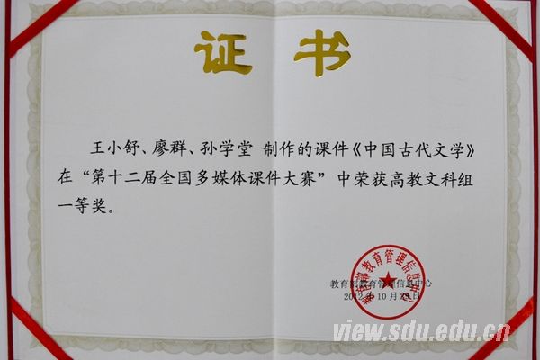 全国多媒体课件大赛由教育部教育管理信息中心主办,分别设置高教文科组、高教医学组、高教理科组、高教工科组等类别的参赛项目,各评出一等奖作品5件,二等奖作品10件,三等奖作品30件。此次大赛在参赛课件的规模与范围、作品的数量与质量等方面都全面超过往届,共收到有效参赛课件1861个,涉及参赛学校420所,参赛作者7382人。山东大学《中国古代文学》经过网上初赛、现场决赛,从630多门高教文科组课程中脱颖而出,获得一等奖。