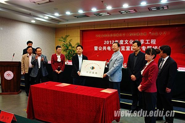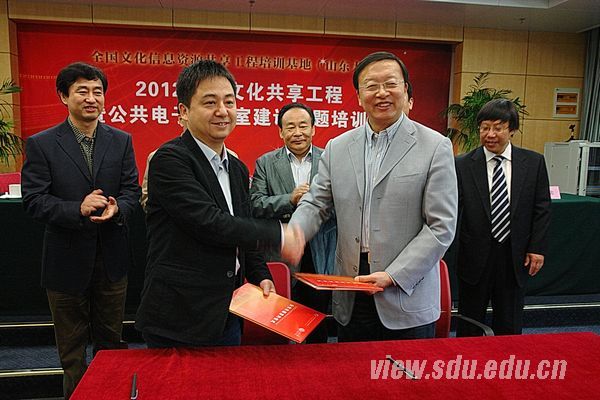 [本站讯]10月19日上午,文化部全国文化信息资源共享工程(山东大学)培训基地签约授牌仪式和2012年度文化共享工程暨公共电子阅览室建设专题培训班开班典礼在山东大学举行。文化部全国文化信息资源建设管理中心主任李宏代表文化部与山东大学签署了基地建设协议,并向山东大学基地授牌。山东大学党委副书记方宏建、山东省文化厅副厅长李宗伟出席仪式。
