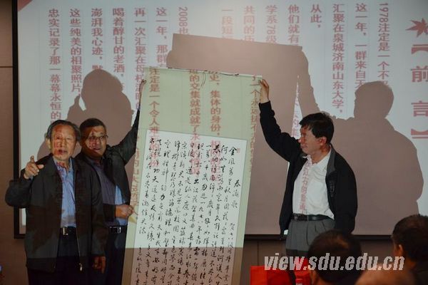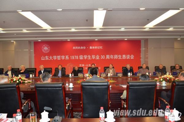 [本站讯]10月20日,山东大学哲学78级学生毕业30周年师生恳谈会在中心校区举行。校党委副书记方宏建出席恳谈会并致辞。 方宏建对78级校友重返母校表示欢迎,并用“老、大、特、新”四个字详细介绍了山东大学的办学历史、办学规模、现状及发展前景,重点介绍了青岛校区的建设情况。他感谢校友多年来对母校发展的支持,希望广大校友在母校重温青春的梦想,并继续关注母校,支持母校发展。 会议伊始,与会师生共同聆听了《校友之歌》,并回顾了78级入学三十周年聚会合影。在深情演唱和怀旧老照片的引领下,校友们仿佛又回到了30年前。哲社学院院长刘杰主持恳谈会。院党委书记杨斌代表学院表达了对校友的热烈欢迎,介绍了学院近年来快速发展的情况,真诚希望富有智慧、学识和经验的校友为学院的发展献计献策,愿与校友共同续写哲社人灿烂华丽的篇章。哲学系教师代表臧乐源、杨贵昌、李武林、王复三以及参会的学生代表纷纷发言。老师们回忆了昔日治学之不易、求学之艰苦,对78级学生严谨治学、艰苦求学的精神面貌给予了好评,希望大家把山大人的作风和品格传承下去,在以后的工作和生活中将个人的生命与事业融合在一起,以积极的态度面对生活。老师们的谆谆教诲给了同学们无限的鼓励,同学们深深的感恩之情也让老师铭记于心。校友们表示,聚会虽然短暂,但哲学78级全体同学将一直支持母校发展,祝愿母校的明天更加美好。 伴随着山东大学校歌的歌声,恳谈会在一片融洽祥和的氛围中结束。哲学78级任课教师、78级校友和学院党政班子70余人参加了恳谈会。会后,校友们纷纷合影留念,记录下这个美好的时刻。校友们还参观了学校博物馆、校园新貌和学院教学科研办公环境。