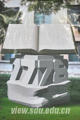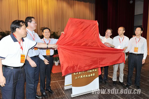 山东大学副校长张永兵(右三)与校友代表一起为纪念雕塑展示图揭幕