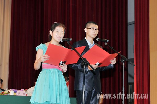 在校生代表、本科2011级学生郑健(右)、黄馨(左)献辞