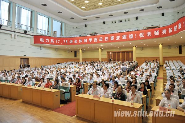 庆祝大会由山东大学电气工程学院党委书记王钧主持。大会上,77、78级同学代表向在主席台就座的各位领导和老师敬献鲜花,表达了全体同学对母校和老师深深的敬意和感恩之情。因学校事业发展和学科调整需要,当年电力系所包含的专业,调整划分到现在的电气工程学院和能源与动力工程学院。作为学院代表,电气工程学院院长刘玉田和能源与动力工程学院院长田茂诚分别向校友们介绍了各自学院发展情况,并表达了对校友们的热烈欢迎和美好祝愿。教师代表张体勤、李淑英深入解析了“77、78现象”,肯定了77、78级同学们在校时期刻苦学习、努力钻研的精神,胸怀天下、立志报国的思想境界;对77、78级同学们在各行各业尤其是国家电力事业建设中取得的辉煌成就表示了热烈的祝贺,并希望同学们与学校、老师的情谊愈久弥香。校友代表电自77班徐曙光、热动77班李良斋、电自78班苏胜新、热动78班王枫、继电78班张春城分别代表各自班级发言,校友们向母校和老师们汇报了在各自工作岗位上取得的成绩,表达了对四年大学时光的怀念、对母校和老师教诲的感恩,并承诺牢记母校的希望,老师的嘱托,努力工作,履行好社会与家庭责任,保持自身的持续进步,并祝愿母校早日建成世界一流大学。