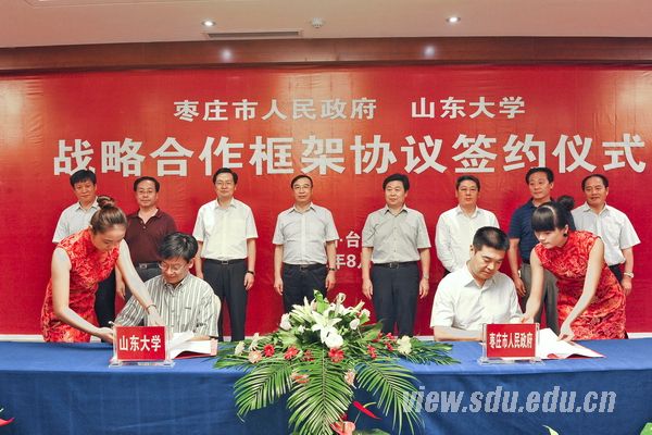 [本站讯]8月25日,山东大学与枣庄市政府签署战略合作框架协议。山东大学党委书记李守信、校长徐显明率全体校领导,枣庄市委书记陈伟、市长张术平等出席签约仪式。山东大学副校长娄红祥与枣庄市副市长霍高原代表双方签署协议。