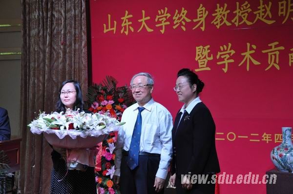 樊丽明在致辞中代表学校向赵明义教授八十寿辰致以祝贺,并高度赞扬了赵明义教授为学校学术发展做出的突出贡献。她说,赵明义教授在学科建设上创造了“五个一”,即:带出了一支过硬的学术队伍,办好了一个独具特色的专业,建设了一个国家重点研究基地,建设了一个国家重点学科,创办了一个全国中文核心期刊。她高度赞扬了赵明义教授执着的治学精神,坚定的政治信仰,以及信仰与学术、理论研究与实践活动相统一的治学风格;肯定了赵明义教授五十年如一日为山东大学培养优秀人才所做出的杰出贡献,以及他80岁高龄仍坚持在工作第一线,为科学社会主义学科发展呕心沥血,为山东大学学科发展献计献策的工作精神。