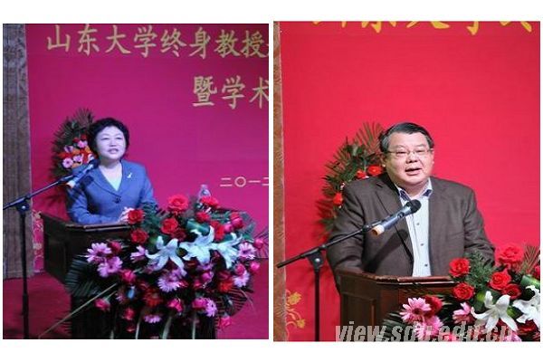 山东大学副校长樊丽明(左)、山东省科学社会主义学会会长包心鉴教授(右)致辞