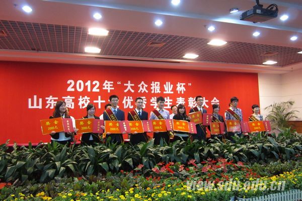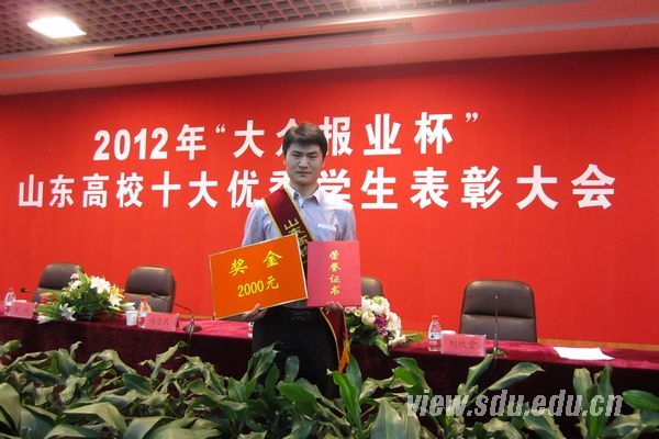 [本站讯]5月2日,由山东省委高校工委与大众报业集团联合主办的2012年“大众报业杯”山东高校十大优秀学生表彰大会在济南大学举行。山东大学化学与化工学院2010级博士生董人豪被评为山东高校十大优秀学生。公共卫生学院2008级本科生岳大海、威海校区海洋学院2008级本科生贺丹获得山东高校十大优秀学生提名奖。