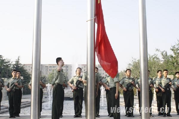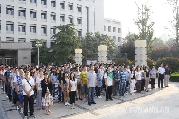 早上7点,山东大学在中心校区大成广场隆重举行升旗仪式,校团委书记王君松、各学院团委老师及学生代表参加了升旗仪式。由山东大学国防生组成的国旗护卫队踏着整齐的步伐,将国旗送至升旗台。伴着激昂的《义勇军进行曲》,在庄严的注目礼下,五星红旗冉冉升起。参加仪式的全体师生齐唱国歌,表达了对先烈的缅怀之情,表现出强烈的爱国热情和与时代共进的使命感。