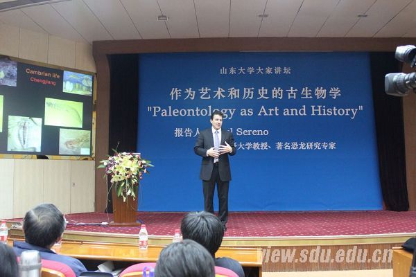 娄红祥为赛伊诺教授颁发了山东大学讲座教授聘书,并表达了通过两校科研和文化交流项目,尤其是赛伊诺教授在山东省平邑、诸城恐龙化石的研究工作,促进山东大学和芝加哥大学进一步交流与合作的愿望。赛伊诺教授在题为《作为艺术和历史的古生物学》的演讲中,介绍了平邑县天宇自然博物馆恐龙化石的收藏情况,并结合自己的研究解读了该博物馆化石藏品的科学价值。他以自己一生的探险生涯,图文并茂地介绍了自己为了寻找恐龙而在非洲、美洲、亚洲等多个国家和地区的传奇经历以及种种令人振奋的发现。一具具静态、平面的恐龙化石在赛伊诺教授的手上变成了活灵活现的恐龙,而所有这些都有着坚实的科学基础,并辅之以合理的艺术创造。演讲加深了同学们对古生物学、尤其是恐龙研究的了解,激发了大家探索大自然和未知世界的兴趣。演讲结束后,赛伊诺教授回答了同学们的问题。娄红祥,国际处处长佟光武以及国际处、校团委有关负责人等参加“大家讲坛”,山东大学博物馆馆长方辉主持演讲。本次活动由校团委、博物馆、国际合作与交流处共同主办,也是芝加哥大学——山东大学美国文化交流中心组织的第三场系列讲座活动。
