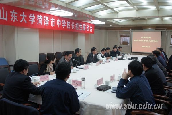 14日,山东大学在菏泽市召开了中学校长座谈会。陈炎在讲话中对山东大学的基本情况、人才培养理念、学校办学目标和蓬勃发展态势作了介绍,并表示,学校一贯重视与中学的联系与合作,通过“走出去”、“请进来”等多种形式的教育拓展品牌活动,与更多知名中学强化合作、共同发展。菏泽市教育局副局长袁洪升在会上表示,今后将继续深化与山东大学的合作与交流,努力取得资源共享、合作共赢的良好成效。各中学校长围绕山东大学的综合学科优势、人才培养特色、拔尖创新人才培养、特殊类型招生、高考志愿填报等展开讨论,并表示将不断加强中学与大学的交流与合作,互相支持,共同担负培育拔尖创新人才的使命。山东大学招生(教育拓展)办公室负责人回顾了学校近几年的招生及教育拓展情况,并就2012年招生设想、计划拟定、招生改革、优秀生源延揽举措等招生政策进行了介绍。来自菏泽市十个县市区的十所重点中学的校长参加了会议。